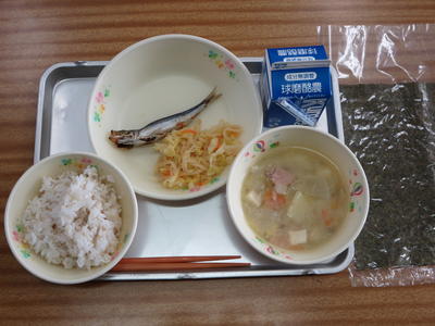 今日の給食の献立は、昔の給食メニューで、めざし、豚汁、セルフおにぎりでした。