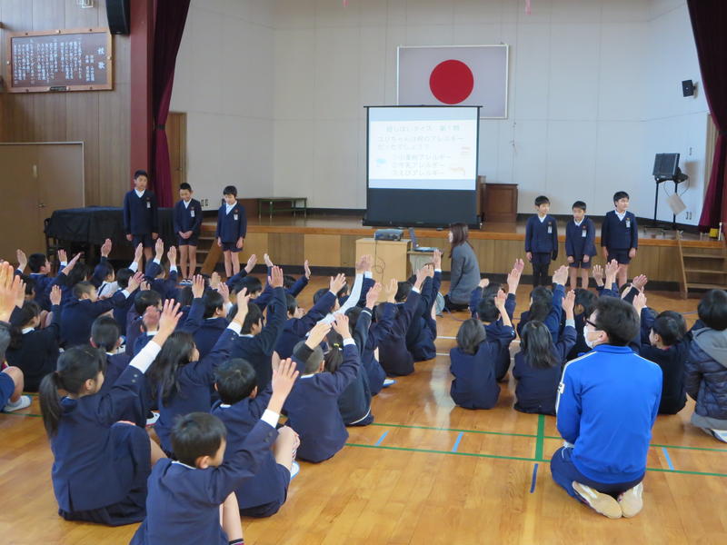 今日の児童集会では、健康委員会が、食物アレルギーについての発表を行いました。