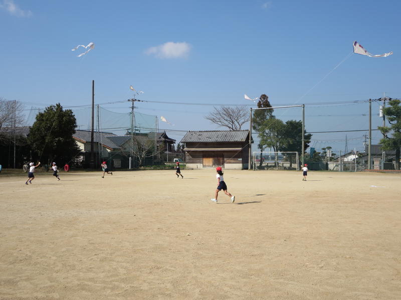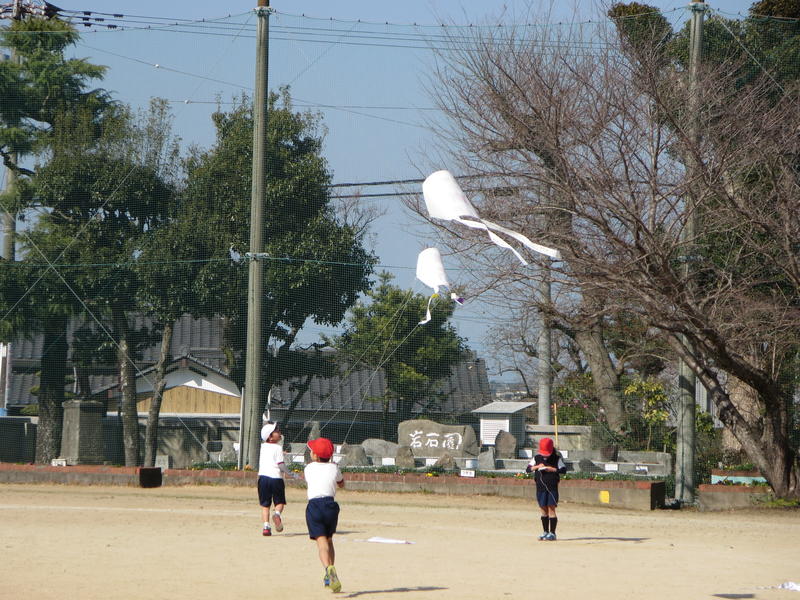 1年生は、生活科で凧を作り、今日は実際に凧あげをして楽しみました。風がほとんど吹いていなかったので、思いっきり走ると、凧はグングン空に舞い上がっていきました。