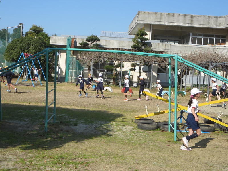 2年生は、もっと楽しく遊べるように工夫して考えたケイドロ遊びを、他の学年の子どもたちとも一緒に遊んで交流しています。今日は3年生と交流しました。実際にやってみて、もっと楽しく遊べるように改善しながら元気いっぱいに遊ぶことができました。