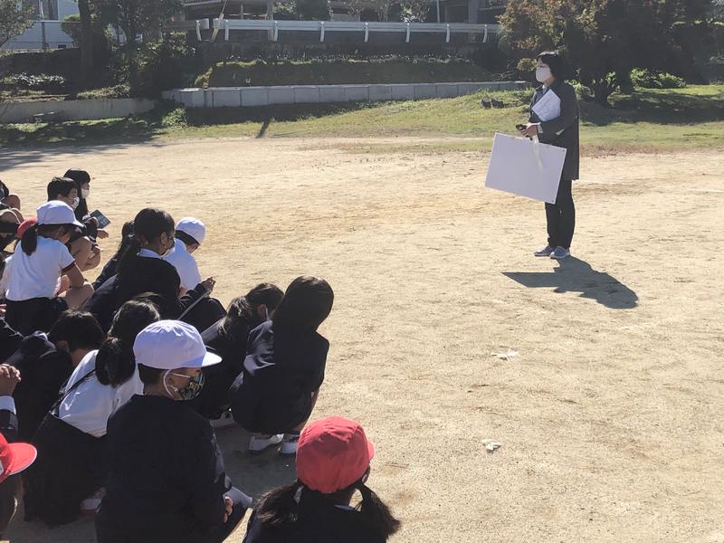 【運動場に避難後、避難の仕方について話を聞く児道】
