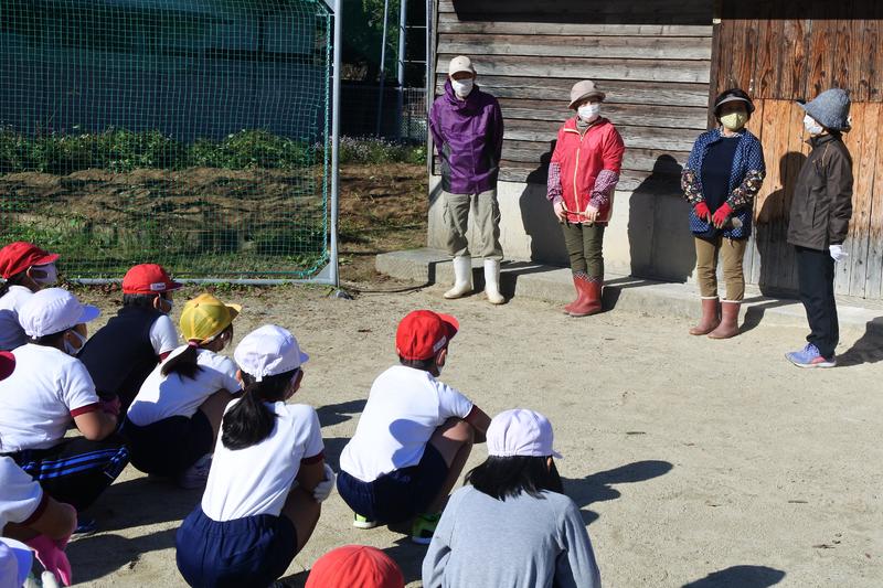 当日は、地域にお住まいの福島様ご夫妻と下川様においでいただき、子供たちが掘りやすいように茎や葉を切り落としたり、被せていたビニルシートをはがしたりする下準備や堀り方の指導などをしていただきました。