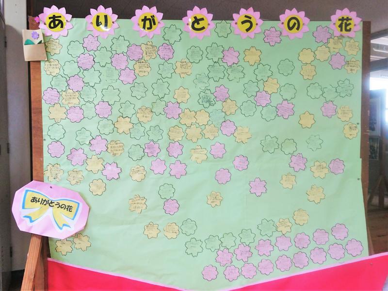 現在、子供たちは、校内人権月間の取組の一つとして、「ありがとうの花」を咲かせています。これは、友達に親切にしてもらったり、嬉しかったりしたことなどを、花の形のカードに記入して、廊下に設置されたボードに貼っていく取組です。