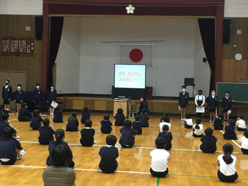 11月12日(木)、始業前の時間に、体育館にて、図書委員会が発表をしました。