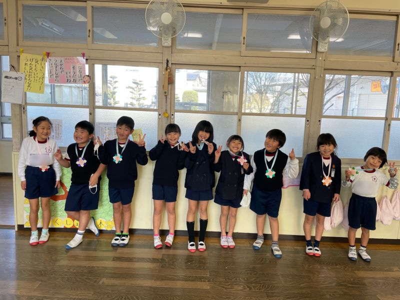 二学期から続けてきた九九マラソンですが、ついに全員校長先生から合格を頂き、キラキラメダルをゲットしました!!それぞれ色違いのきれいなメダルをゲットし、全員そろったことで、にこにこの2年生でした♪