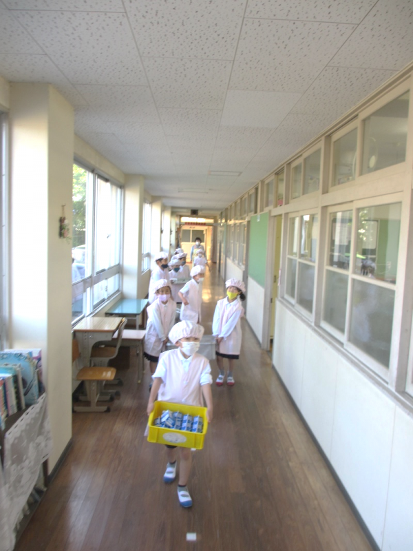 まずは給食です。「重い!」の声があちこちから聞こえました。それでも、みんなの大切な給食をがんばって運びました。