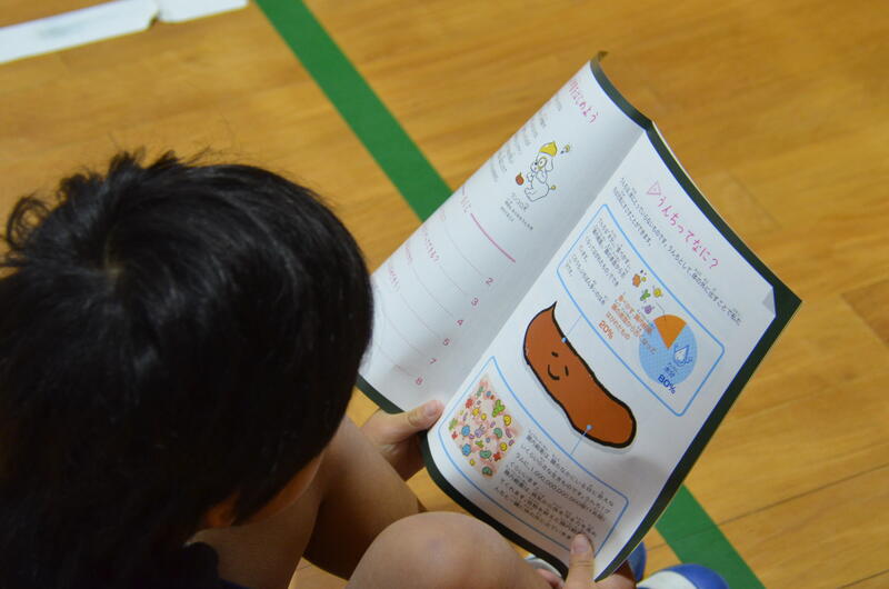 子供たちは、うんちの教科書の「うんちってなに?」「うんちはどうやってできるの?」「うんちのみわけかた?」等々の資料から自分の便の状態を知り、体の調子や健康について考え、いいうんちを出すために大切なことを学んでいました。