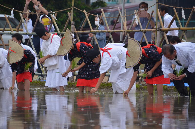 御田植祭は、農作業の工程を模擬的に演じ、豊作を祈念する行為だそうですが、文化的・伝統的な行事を継承したり、稲作の伝承をしたりする意味もあるそうです。
