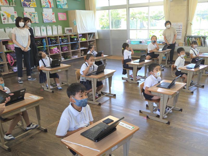 夏休み中のタブレットパソコンの持ち帰りを前に、ログインの仕方などの基本的な操作を練習しました。