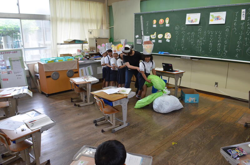 国語の授業は「おおきなかぶ」を読んで、登場人物の行動や様子を動作化して考える学習をしていました。物語の内容と動作から「おおきなかぶ」を抜く場面の様子や人物の行動を豊かに想像することができていたようです。