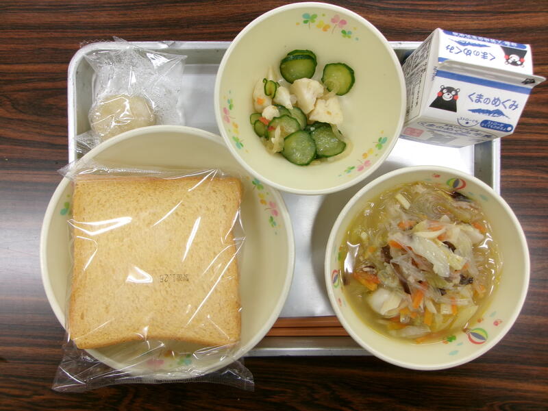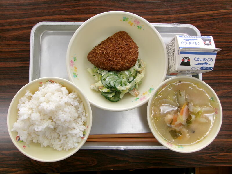今日の献立は、麦ごはん、うまかコロッケ、ちくワンサラダ、トマトだご汁、牛乳でした。