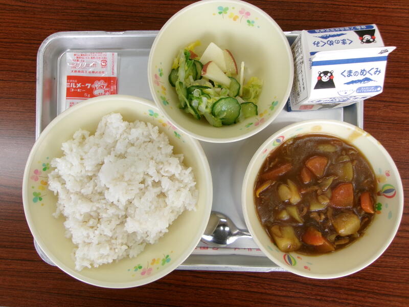 今日の献立は、麦ごはん、チキンカレー、白菜とりんごのサラダ、ミルメーク、牛乳でした。