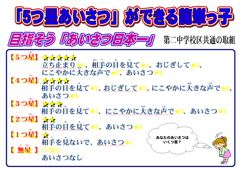 第二中学校区では、「5つ星あいさつ」を目指す取組を行っています。