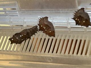 蛹になると、金色に輝き、背中には金色の金属光沢の突起があり、とてもゴージャスでかっこいいです!