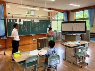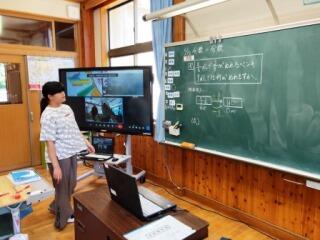 教室ではパソコンを2台接続することで,黒板を映したりデジタル教科書を投影したりしながら,なるべく普段の授業と変わりなく学習できるようにしています。