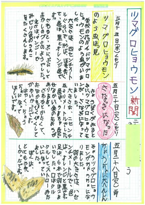 2年生の生活科「はっ見したことを知らせよう」の学習で、これまで観察してきた「ツマグロヒョウ」のついてまとめたことを新聞にして、みんなに知らせました。