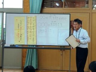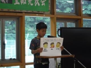今日は,ロングきたっこタイムに人権集会がありました。心のきずなを深める月間である今月に,各学年が人権について学習したことを発表したり,各学級ごとに決めた学級人権目標を発表したりしました。