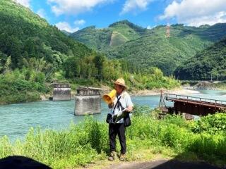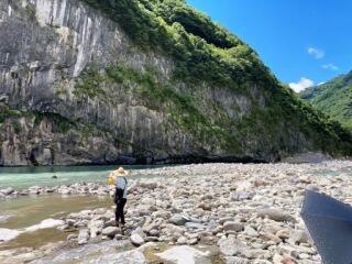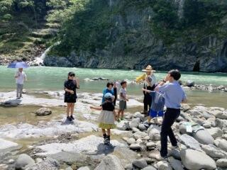 午前中最後の目的地に到着。奥に見えるのは「槍倒しの瀬」と呼ばれる名所です。