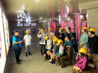 長靴とヘルメットを身につけて,ガイドの方の説明を聞いています。