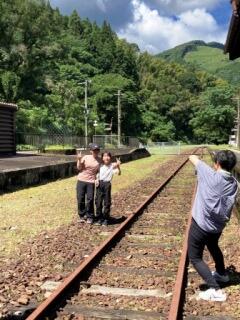球磨村の渡駅に到着。奥に見える駅の建物近くの電信柱は今でも倒れたままで,水害の被害の大きさを物語っています。