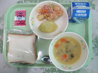 学級での配膳回数を少なくするために、主食を個包装のパンにしています。