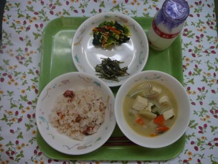 たこめし みそけんちん汁 五色あえ いりこの青のりあえ 牛乳