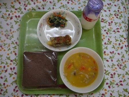 ココアパン コーンポタージュ もやしのナムル 竹輪のチーズあげ 牛乳