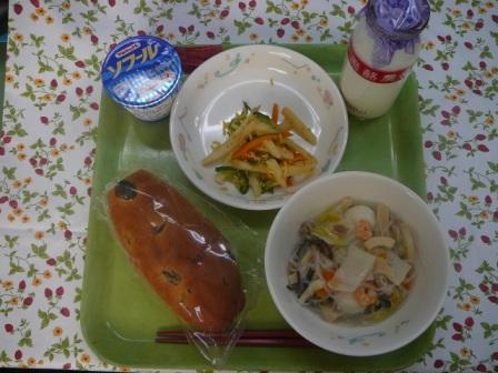 米粉パン ウィンナーのチリソース煮 キャベツのゆかりあえ 大学芋 牛乳