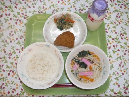 ごはん 魚そうめん汁 すき昆布のサラダ 白身魚のあんかけ 牛乳