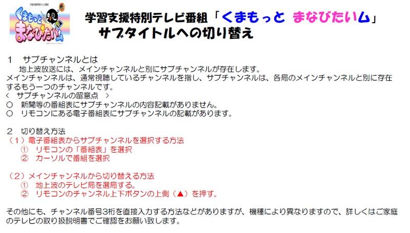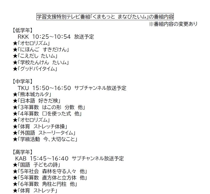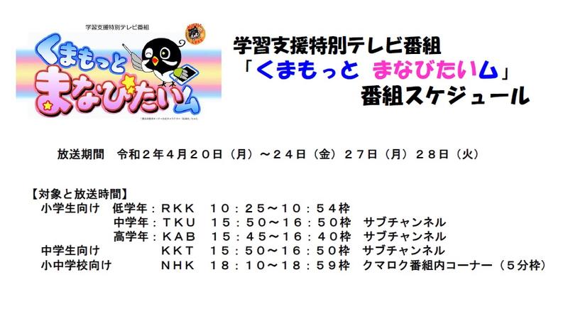 熊本市では、県内のテレビ局と教育委員会が共同して、休校中の小中学生のためのテレビ授業「くまもっと まなびたいム」が放送されるそうです。学習の一助としてご活用いただければ幸いです。放送日や放送時間は、以下の通りです。