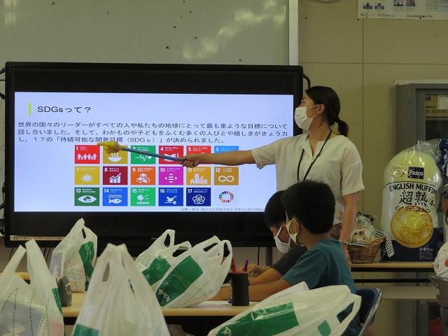 SDGsや持続可能な食生活について学び、食に関する関心を高めることをめあてに、出前授業がありました。今回は、総合的な学習の時間のテーマに「環境」を掲げている5年生を対象にして行われました。