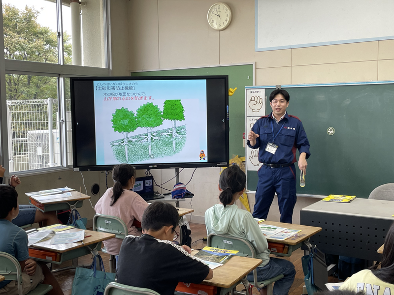 森林保全課の松下さんや防災士の方をお招きして、防災の対策や災害がなぜ起こるのかなどを説明してもらいました。
