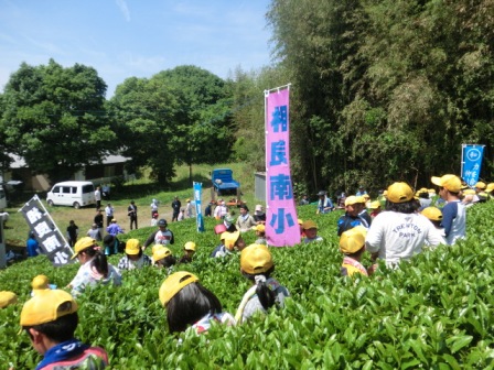 5月8日(金)、晴天のなか全校でお茶摘みをしました。児童は一枚一枚丁寧にお茶の葉を摘んでいました。おいしいお茶になるのを楽しみにしています。