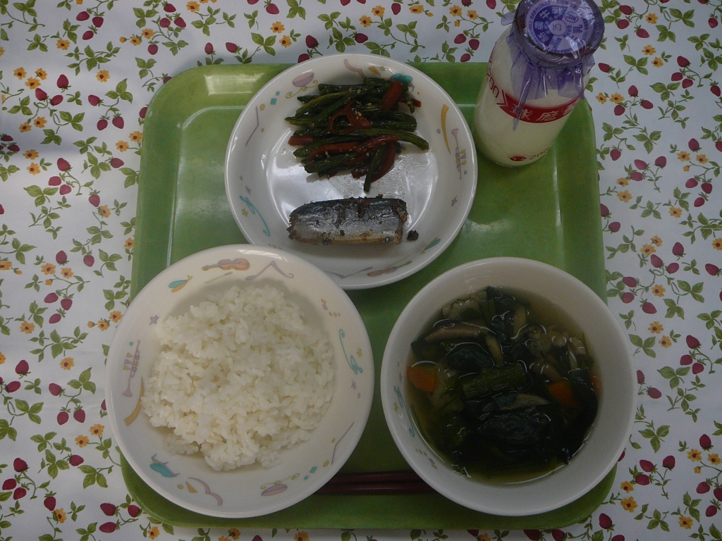ごはん お茶のつみれ汁 いんげんの揚げ漬け さんまの梅煮 牛乳
