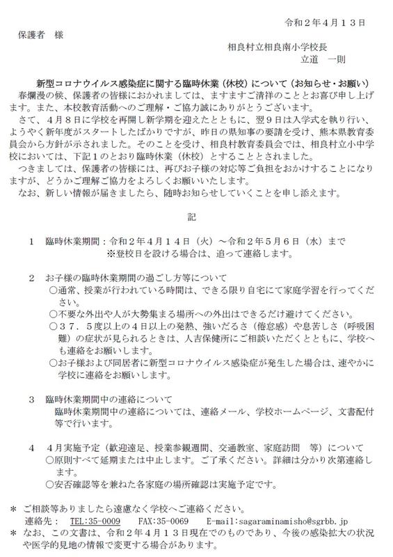 【重要:お知らせ・お願い】臨時休業(休校)について(4月13日)