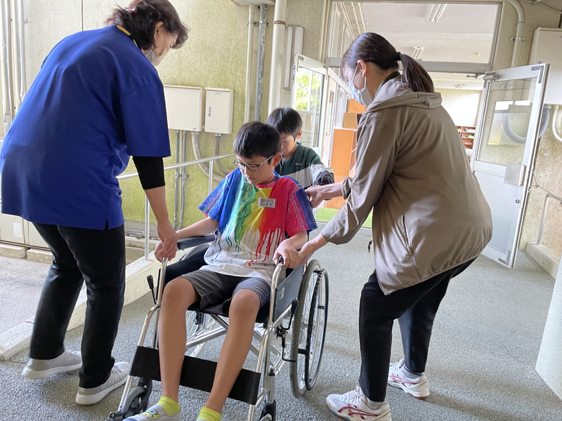 車いす体験では、車いすに乗っている人の気持ちが分かったようでした。乗る前は「楽しそう」と言っていましたが、実際に乗ってみると「段差や坂道が怖かったです。声掛けをすることが大切だとわかりました。」と乗る人や押す人の視点に立って考えることができました。