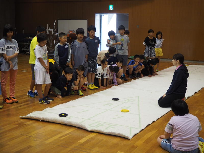 ニュースポーツ1つ目はシャッフルボードをしました。カーリングに似たスポーツで力加減が難しいようでしたが、楽しんで活動できました。