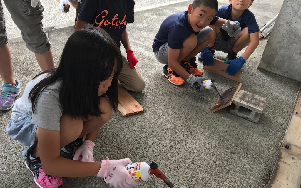 電動ドリルやガスバーナーを使いながら、みんな焼き杉に燃えています!
