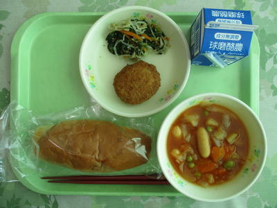 今日のポイントは、ウィンナーのチリソース煮です。学校給食用の