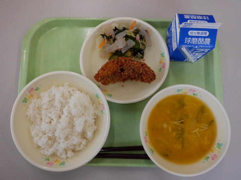 ・麦ごはん ・魚そうめん汁 ・鶏肉の茶衣揚げ ・キャベツの甘酢和え |