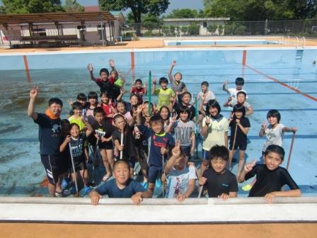 今週プール掃除がありました。みんなが楽しみにしていたプール掃除です。3年生から6年生までの児童が小プール、大プールを掃除しました。おかげで、プールもきれいになりました。