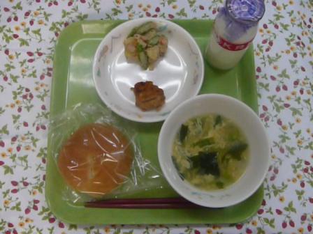 米粉パン かきたま汁 新じゃがとアスパラのねりごまあえ タンドリーチキン 牛乳