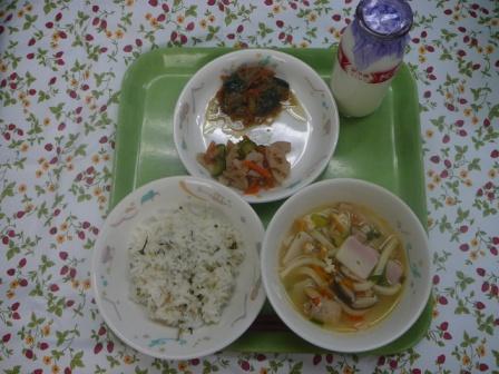 なめしご飯 うどん れんこんサラダ 揚げなすのごま煮 牛乳