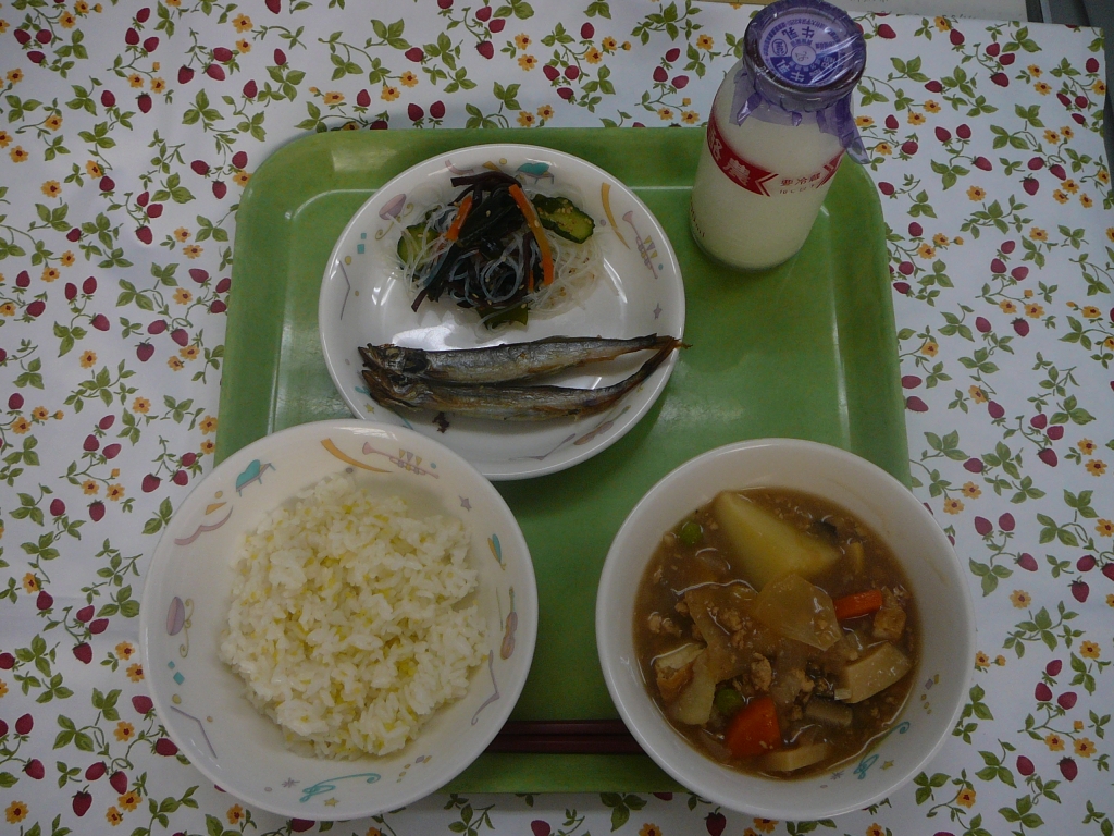 きびごはん 新じゃがのそぼろ煮 春雨の酢のもの 焼きししゃも 牛乳