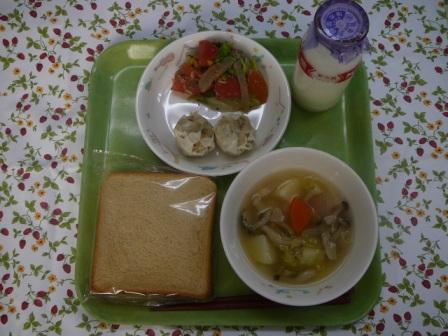 黒糖パン ポテトスープ 四浦こんにゃくのサラダ シューマイ 牛乳