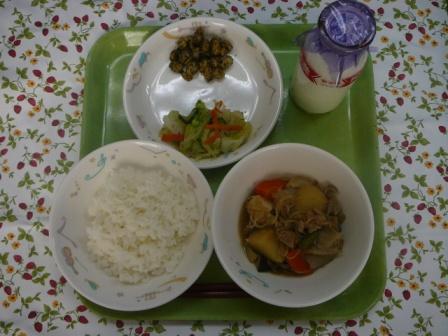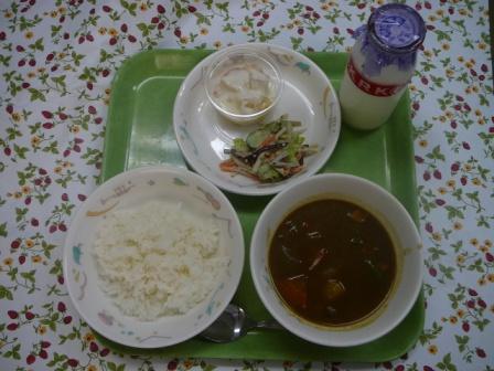 今日は子ども達の大好きな献立でした。カレーはもちろん、フルーツヨーグルトも人気があります。ヨーグルトは球磨酪農農業協同組合で作られた「球磨の恵み」を使っています。よく混ぜるとトローリとしたおいしい食感を味わうことができます。給食では、果物やゼリーを一緒に混ぜてだしています。