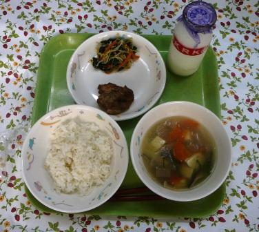 今日は、給食で初めてもずくを取り入れました。もずくの配膳は難しいので、一人ずつカップに入れて