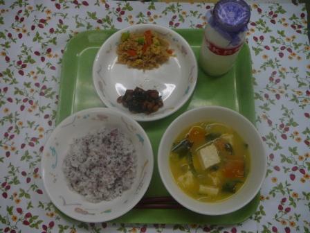 赤米ごはん むらくも汁 キャベツときゅうりのおかかあえ きびなごのカルフルあげ 牛乳