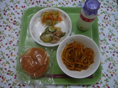 パインパン スパゲティミートソース もやしのピーナツあえ 鶏肉とズッキーニの炒め物 牛乳