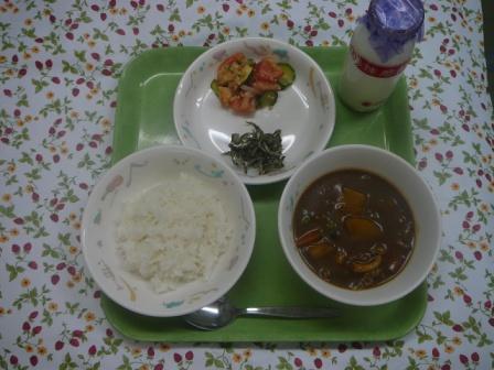 ごはん ポークカレー トマトサラダ いりこの青のりあえ 牛乳